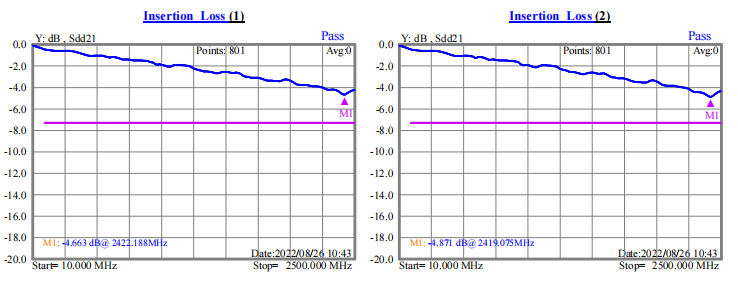 我們以ph0.5-51p-300lvds排線來說明。0.5x51x300xA兩面不貼復(fù)合鋁箔,測試結(jié)果如下圖(一),0.5x51x300xA單面貼復(fù)合鋁箔,測試結(jié)果如下圖(二)。