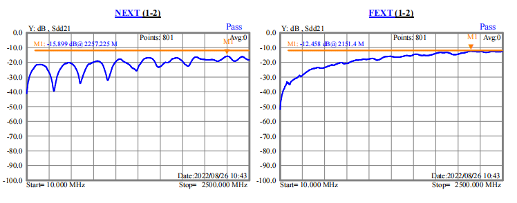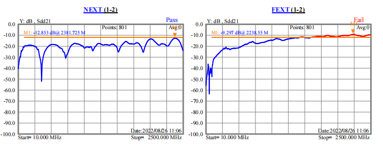 從圖一與圖二數(shù)據(jù)可以看出,不貼復(fù)合鋁箔,近串-12.8db,遠(yuǎn)串-9.2db(如圖五);貼上復(fù)合鋁箔后,線纜的近串-15.9db,遠(yuǎn)串-12.4db(如圖六)。因此,單面貼復(fù)合鋁箔比不貼復(fù)合鋁箔的串音效果更好。