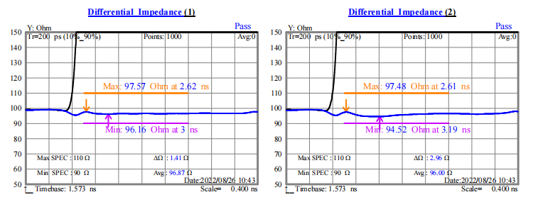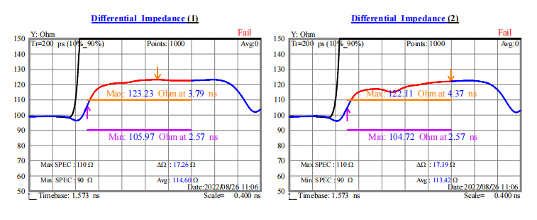 從圖一與圖二數(shù)據(jù)可以看出,不貼復(fù)合鋁箔,排線的特性阻抗平均值為114.6Ω和113.4Ω;貼上復(fù)合鋁箔后排線的特性阻抗平均值為96.8Ω和96Ω。而一般都要求線纜特性阻抗在100±10Ω。下圖七與圖八是不貼復(fù)合鋁箔與貼上復(fù)合鋁箔排線的特性阻抗圖,顯然貼上復(fù)合鋁箔后特性阻抗的波動(dòng)范圍更小,且能控制在標(biāo)準(zhǔn)范圍內(nèi)。